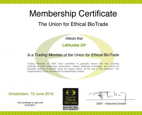ActualitésLATITUDES 23° a reçu pour la 4ème année consécutive son certificat de membre de l’Union for Ethical BioTrade (l’Union pour le Bio-Commerce Éthique).